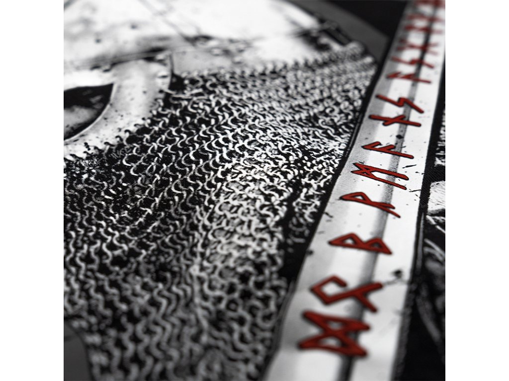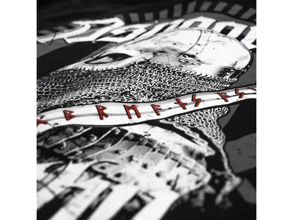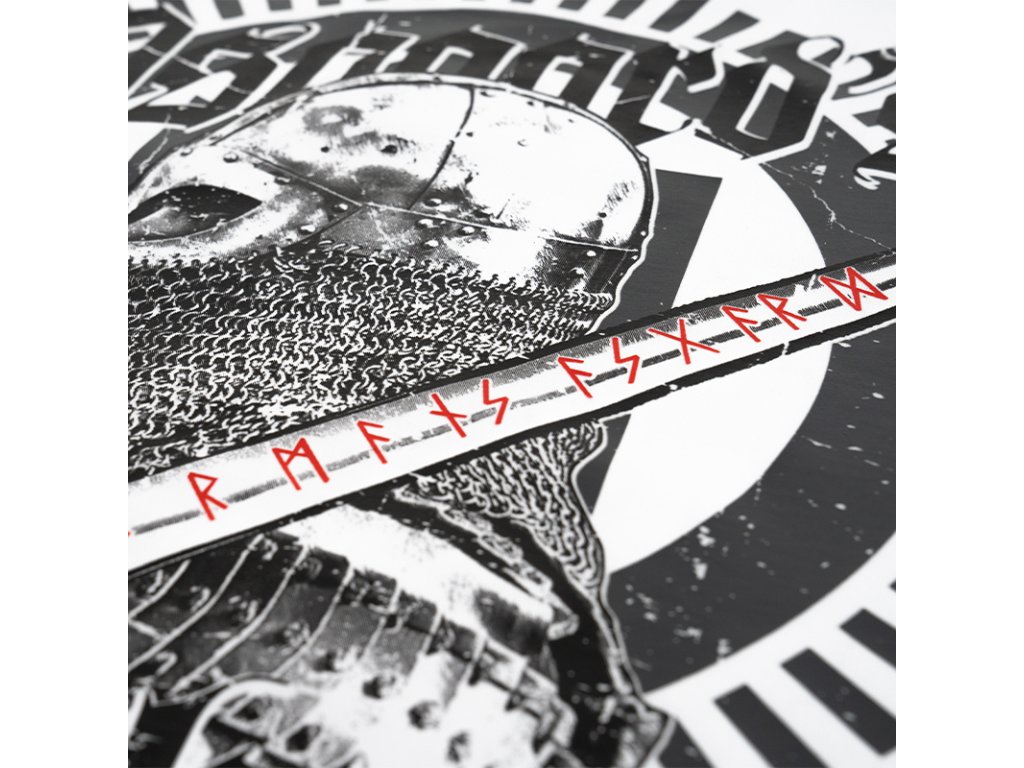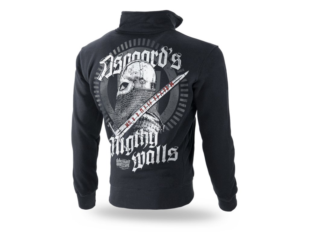 Na ľavom rukáve je našitá malá ceduľka značky Doberman's Aggressive. Na zadnej strane je vzor, ktorý zobrazuje Vikinga s mečom so severskými prvkami. Na prednej ľavej strane mikiny sa nachádza nápis Asgaard's mighty walls.