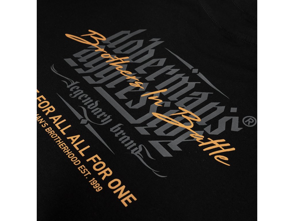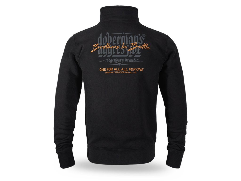 Model je vyrobený v pohodlnom klasickom strihu s vysokým stojatým golierom a zapínaním na zips po celej dĺžke. Na zadnej strane sa nachádza veľká potlač s nápisom „Doberman’s Aggressive – Brothers in Battle“ a sloganom „One for all, all for one“, ktorý odkazuje na bratstvo, lojalitu a jednotu. Mikina je navrhnutá na každodenné nosenie a spája pohodlie s charakteristickým štýlom značky Doberman’s Aggressive. Praktické vrecká a kvalitné spracovanie zdôrazňujú funkčný a pevný charakter modelu.