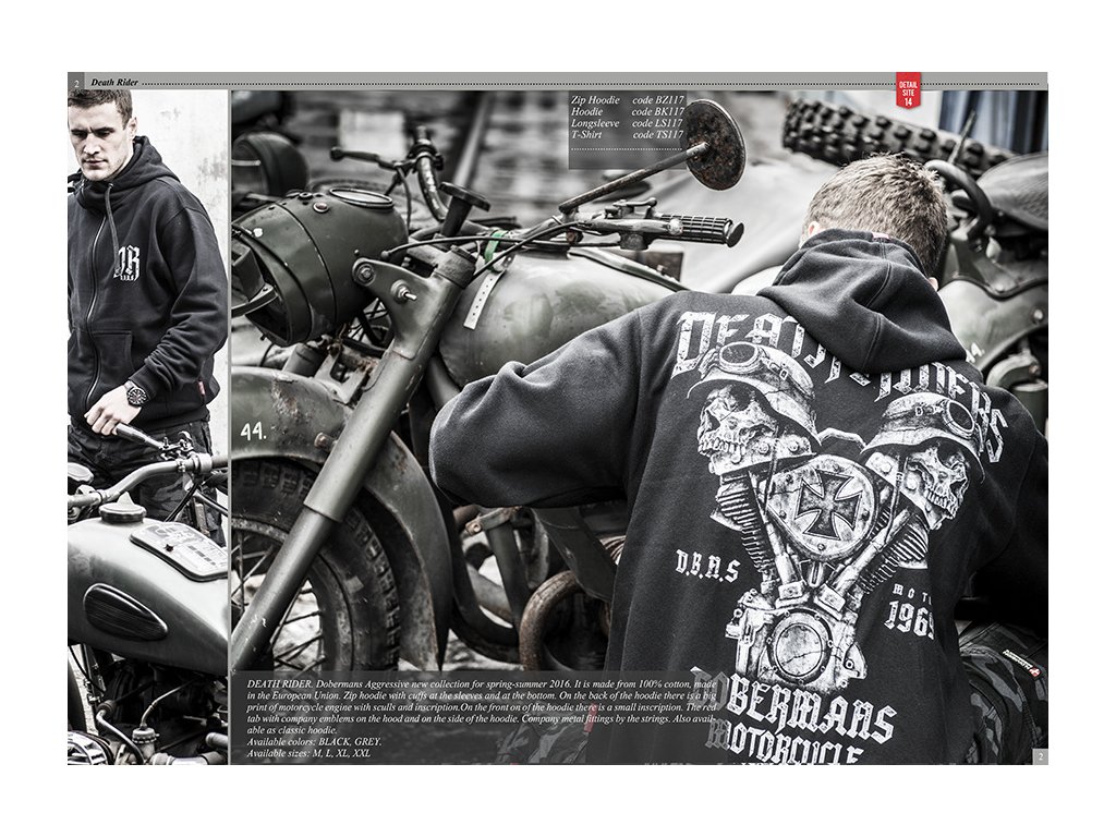 Vyrobená zo stopercentnej bavlny o hmotnosti 320g. Na zadnej strane potlač s motívmi, ktoré sú typické pre kolekciu Death Rider: uprostred motocyklový motor, vyššie dve lebky v helmách s okuliarmi. Vo výške lopatiek názov kolekcie, pod vzorom nápis Dobermans Motocycle. Potlač s efektom prederavenia, ktorá zaberá takmer celý povrch chrbta. Na pravej strane hrudi skratka DR s označením D.B.N.S.