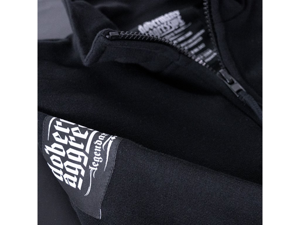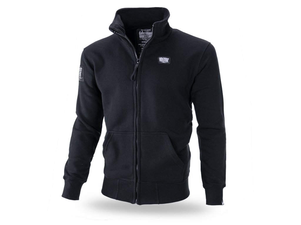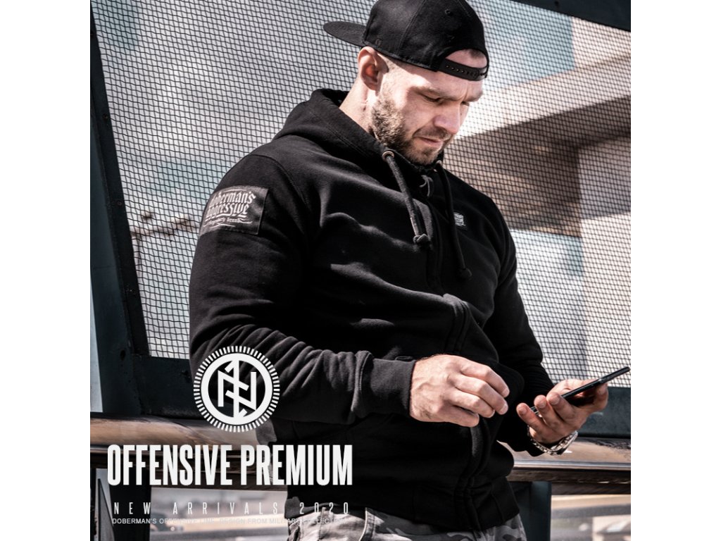 Mikina je z rady Offensive Premium so stojačikom a sťahovacími lemy. Oblečenie z tejto kolekcie sa vyznačuje klasickými vzormi, nadčasovými strihy a prémiovou kvalitou. Na hrudi a ramene sa nachádza nášivka, na zadnej strane gumový symbol. Všetky doplnky sú s logom Doberman's Aggressive.