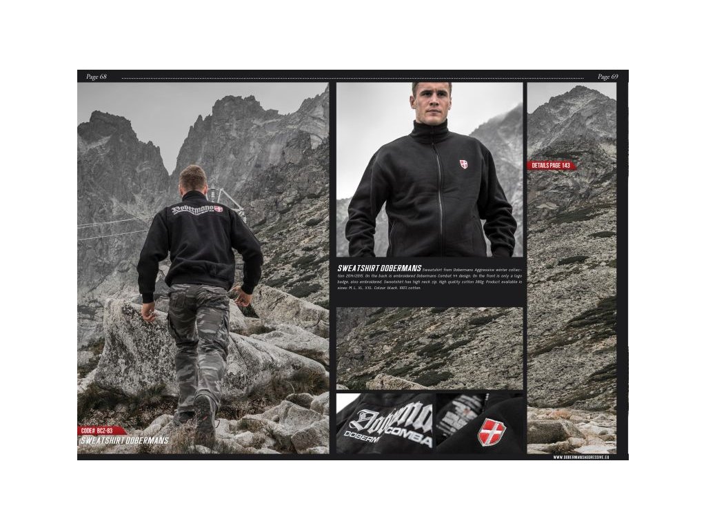 Na prednej strane dve vrecká. Model zakončený širokými elastickými sťahovacími lemami. Mikina je vyrobená zo stopercentnej bavlny o hmotnosti 320g. Na lopatkách široká obdĺžniková nášivka s vyšívanými prvkami: logo Dobermans a znakom štítu s krížom v nórskom štýle. Na ľavej strane hrudi neveľká nášivka v podobe štítu s rovnakým vzorom.