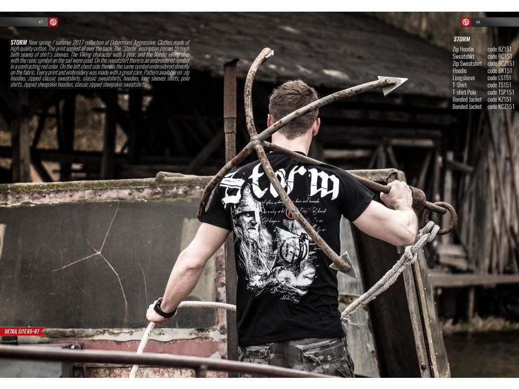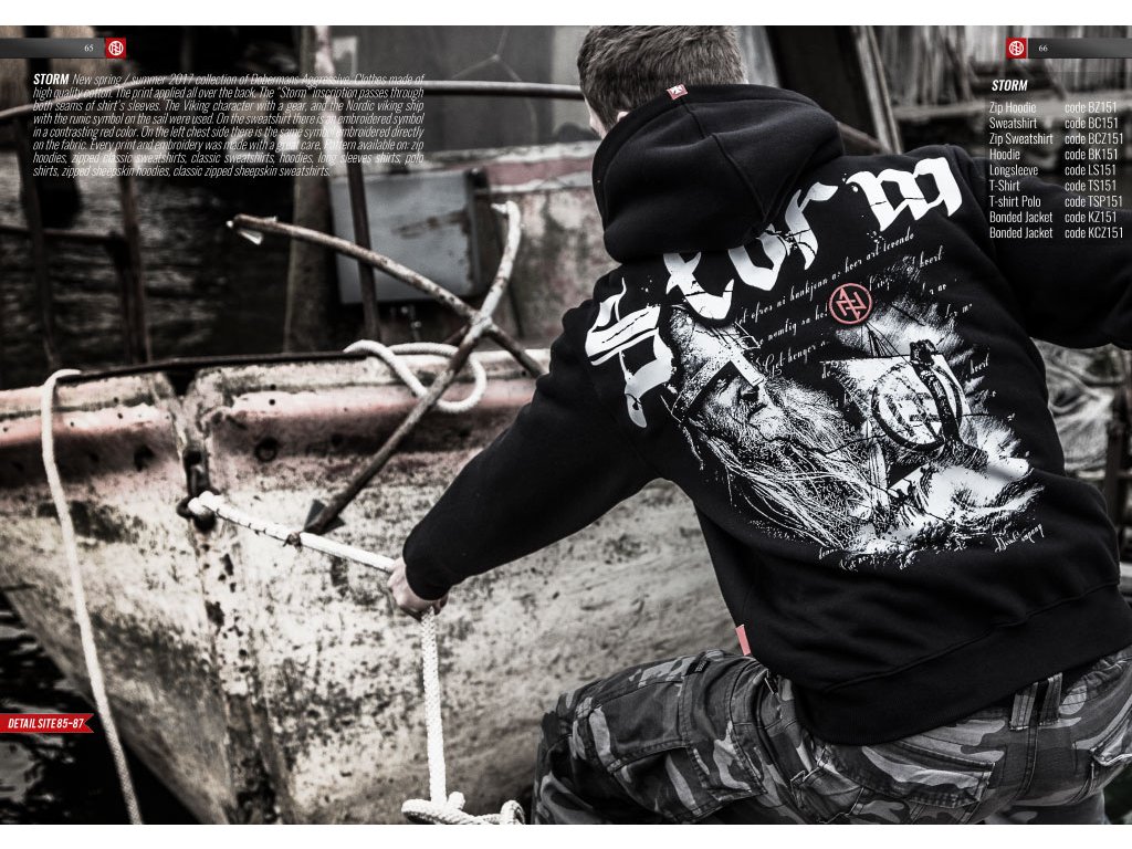 Na úrovni lopatiek veľký nápis Storm v gotickom štýle. Nižšie dvojfarebná vyšívaná nášivka v podobe štítu. Rovnaký znak vyšitý na prednej strane mikiny. Výšivka v červenej farbe zhotovená priamo na látke. Klasická pánska mikina na zips. Pri krku, rukávoch a v spodnej časti sťahovacie lemy, na boku firemný štítok.