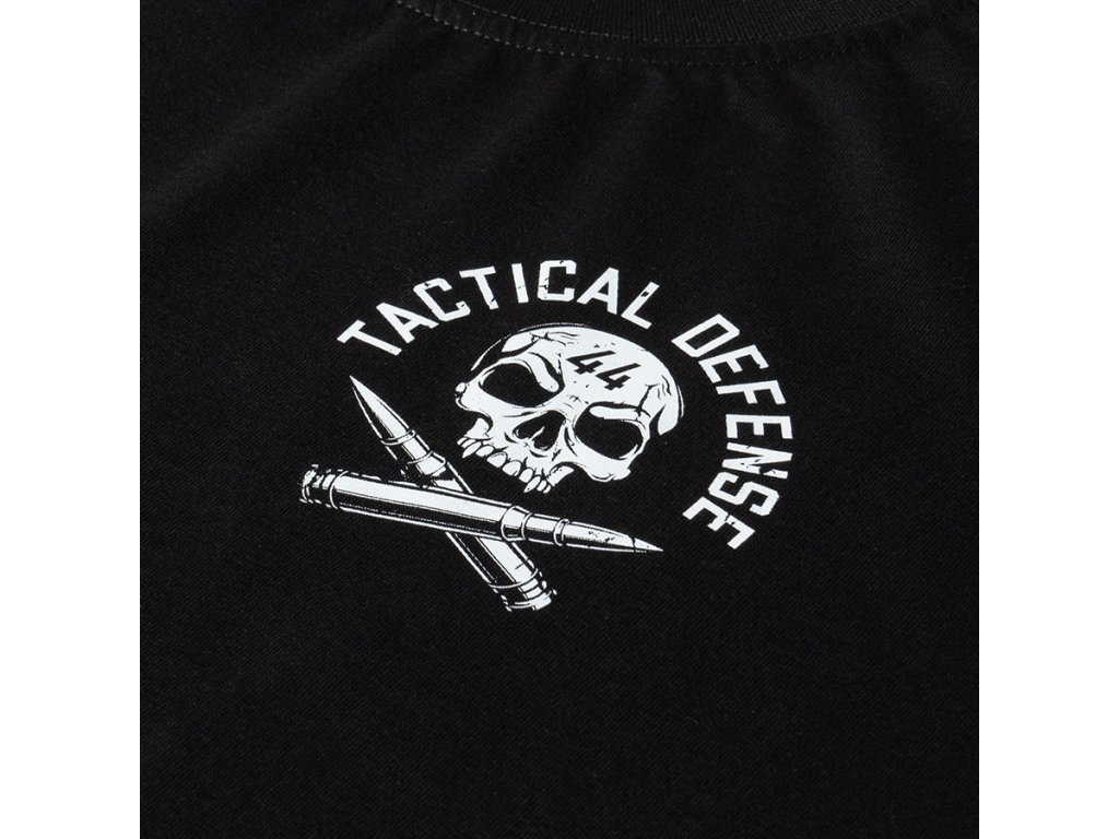 Model s okrúhlym výstrihom zakončeným rebrovaným lemom a rebrovanými manžetami na rukávoch a spodnom okraji. Na prednej strane, na ľavej časti hrude, sa nachádza malá potlač s motívom lebky a skrížených zbraní a nápisom „Tactical Defense“. Zadnú stranu zdobí veľká vertikálna potlač s nápisom „Tactical Defense“, sloganom „Defend Your Land“ a motívom pušky v militárnom štýle. Celkový dizajn pôsobí výrazne takticky.