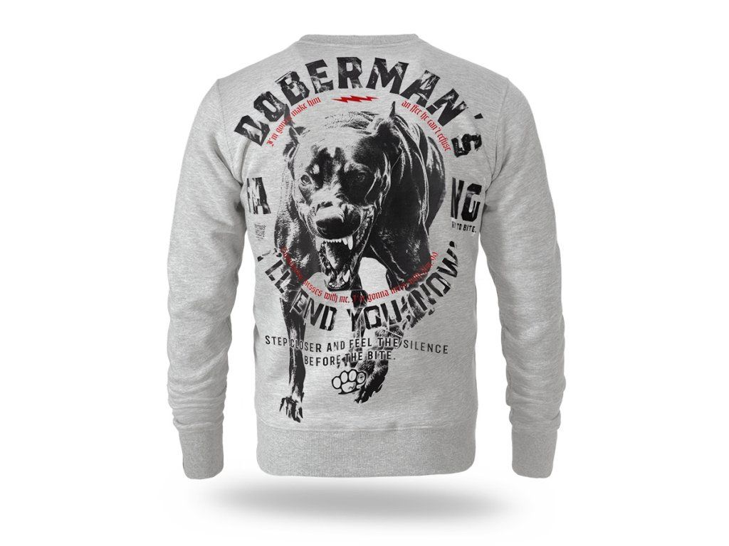 Model obliekaný cez hlavu s okrúhlym výstrihom zakončeným elastickým patentom. Na zadnej strane sa nachádza veľká, výrazná grafika agresívneho dobermana v dynamickej útočnej póze, doplnená silnými sloganmi zdôrazňujúcimi nekompromisný charakter dizajnu. Na hrudi je umiestnená menšia potlač s názvom značky a motívom boxera. Rukávy a spodný lem sú zakončené elastickými patentmi pre lepšie prispôsobenie a pohodlie pri nosení. Celkový vzhľad odráža charakteristický, výrazný štýl značky Doberman’s Aggressive.