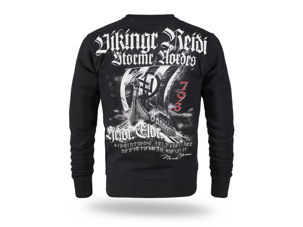 Model vyrobený v pohodlnom klasickom strihu s okrúhlym výstrihom zakončeným elastickým patentom. Na zadnej strane sa nachádza veľká výrazná grafika vikingskej lode drakkar plaviacej sa rozbúreným morom, obklopená severskými symbolmi a nápismi inšpirovanými kultúrou a mytológiou Vikingov. Dynamický motív zdôrazňuje surový bojovnícky charakter škandinávskych bojovníkov. Na hrudi je umiestnená menšia potlač s nápisom „Vikingr Reiði – Nord Storm“, ktorá dopĺňa celkový dizajn. Rukávy a spodný lem sú zakončené elastickými patentmi pre dobré prispôsobenie a pohodlie pri nosení.