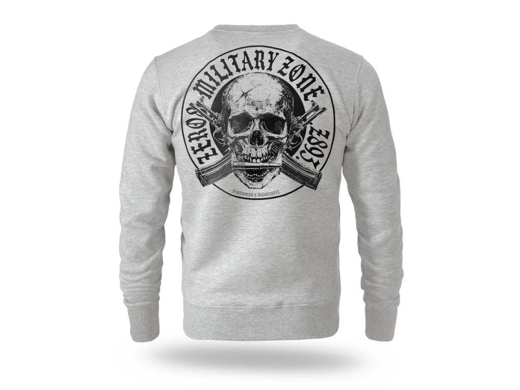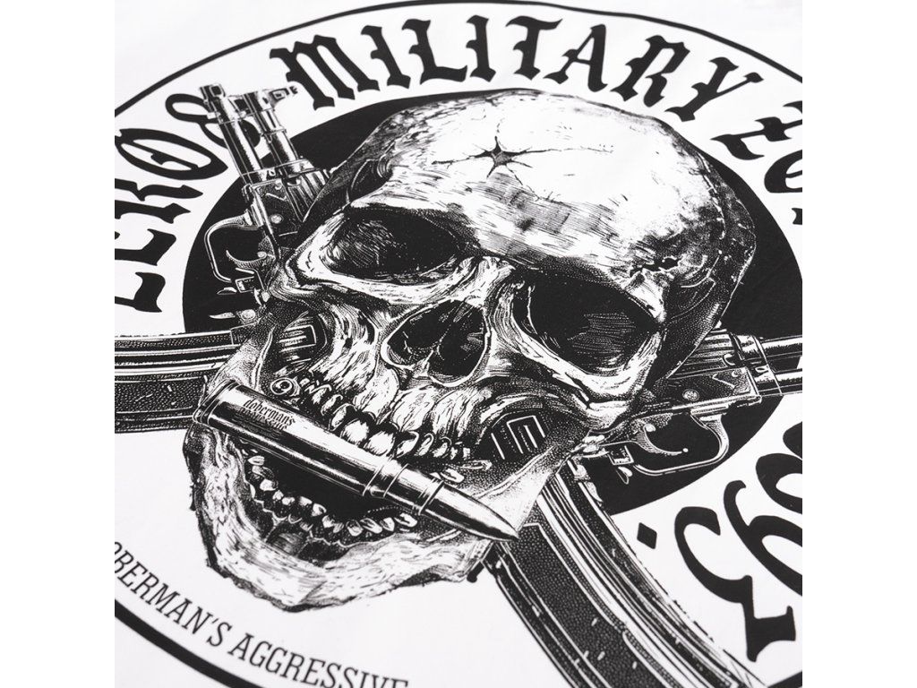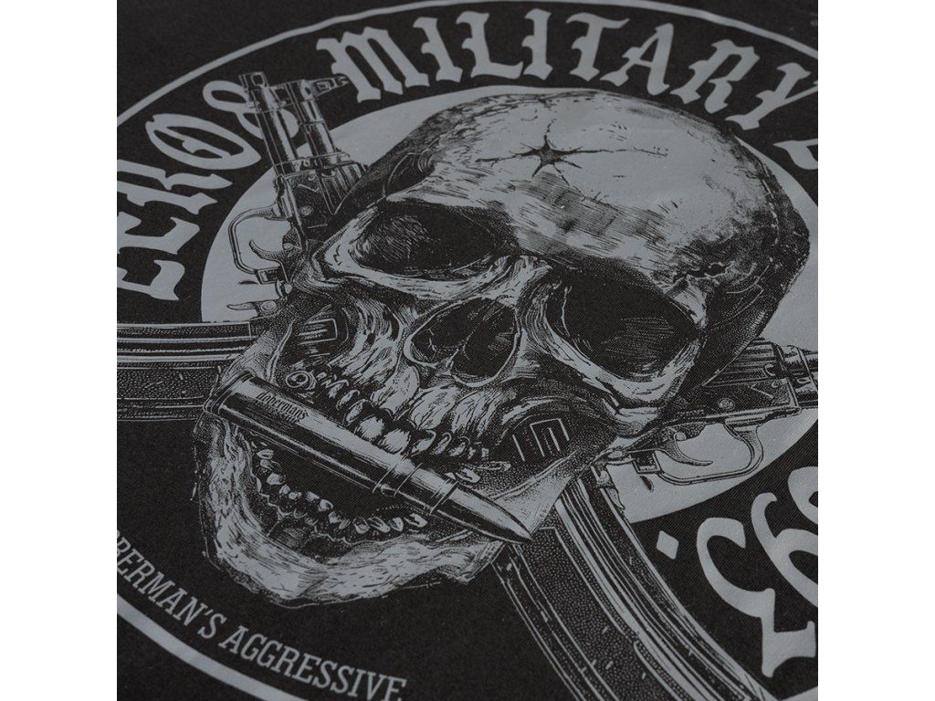 Model vyrobený v pohodlnom klasickom strihu s okrúhlym výstrihom zakončeným elastickým patentom. Na zadnej strane sa nachádza veľká výrazná grafika zobrazujúca lebku na pozadí skrížených pušiek, obklopenú nápisom „Frontline Military Zone 1987“. Motív je inšpirovaný vojenskou estetikou a zdôrazňuje surový a rozhodný charakter dizajnu. Na hrudi je umiestnená menšia potlač nadväzujúca na grafiku na zadnej strane, ktorá dopĺňa celkovú kompozíciu. Rukávy a spodný lem sú zakončené elastickými patentmi, ktoré zabezpečujú dobré prispôsobenie a pohodlie pri nosení.