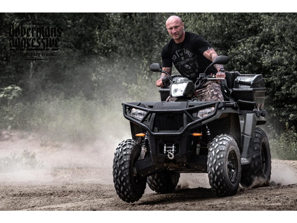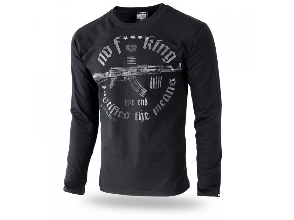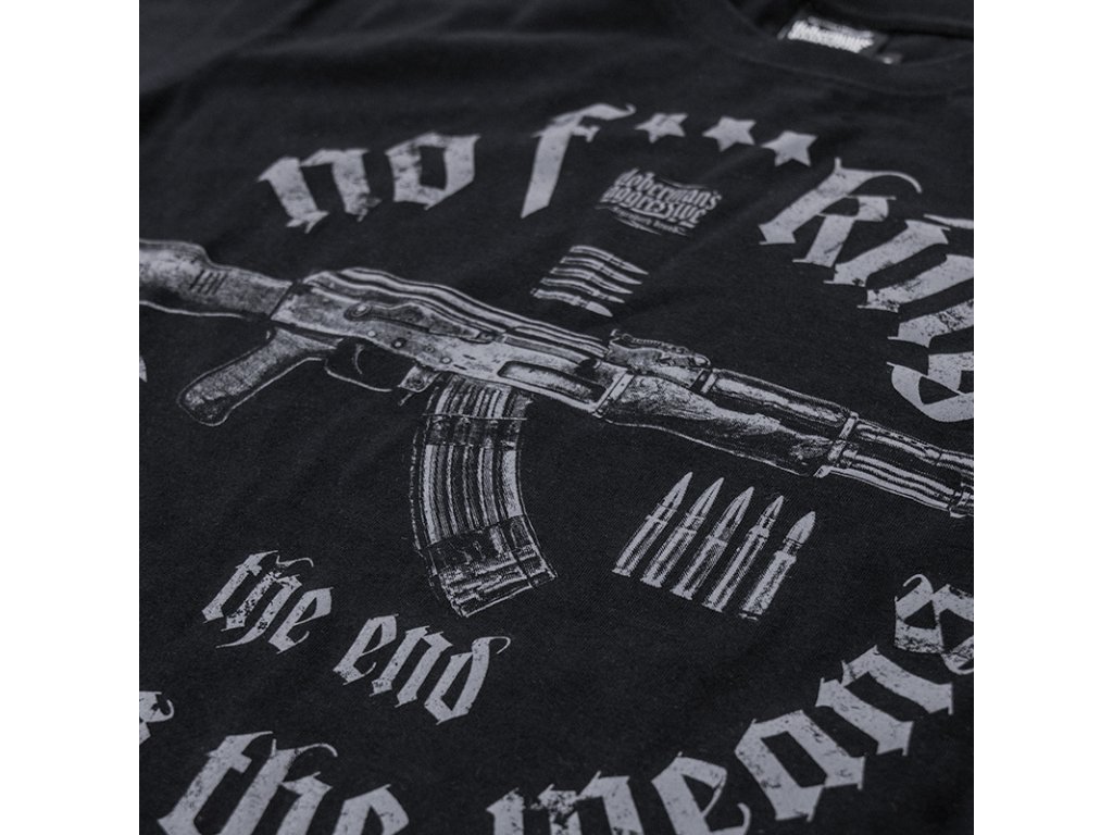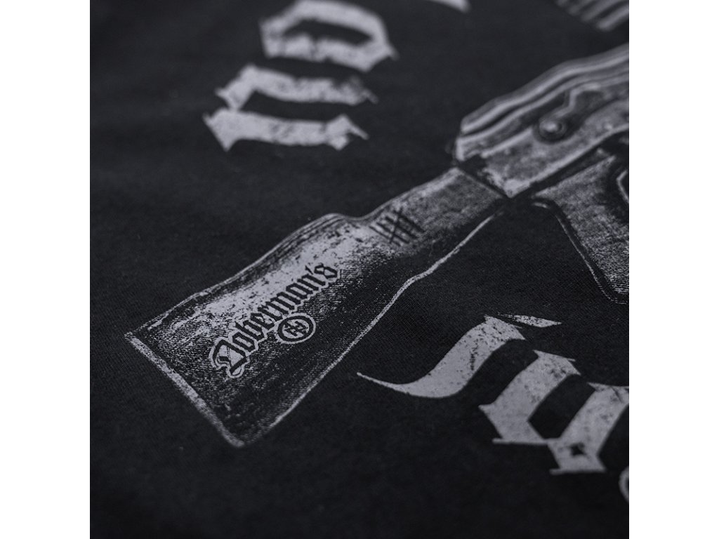 Pri krku je zakončené sťahovacím lemom, ktorý zlepšuje pohodlie nosenia. Štítok s logom Dobermans Aggressive sa nachádza na ľavom rukáve. Na prednej strane trička je veľká potlač v tvare kruhu. Uprostred vzoru sa nachádza puška s nábojmi, obklopená charakteristickým gotickým nápisom.