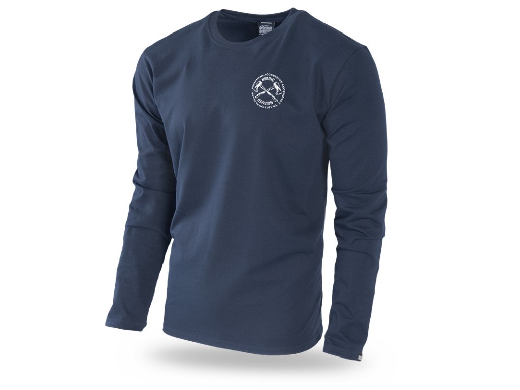 Na chrbte veľká grafika znázorňujúca dve skrížené sekery. Dookola nápis Dobermans Aggressive Legendary Traditional Brand. Na ľavej strane na hrudi rovnaká grafika v menšej mierke. Tričko ušité z bavlny, vysoká hmotnosť látky (200g), dlhé rovné rukávy.