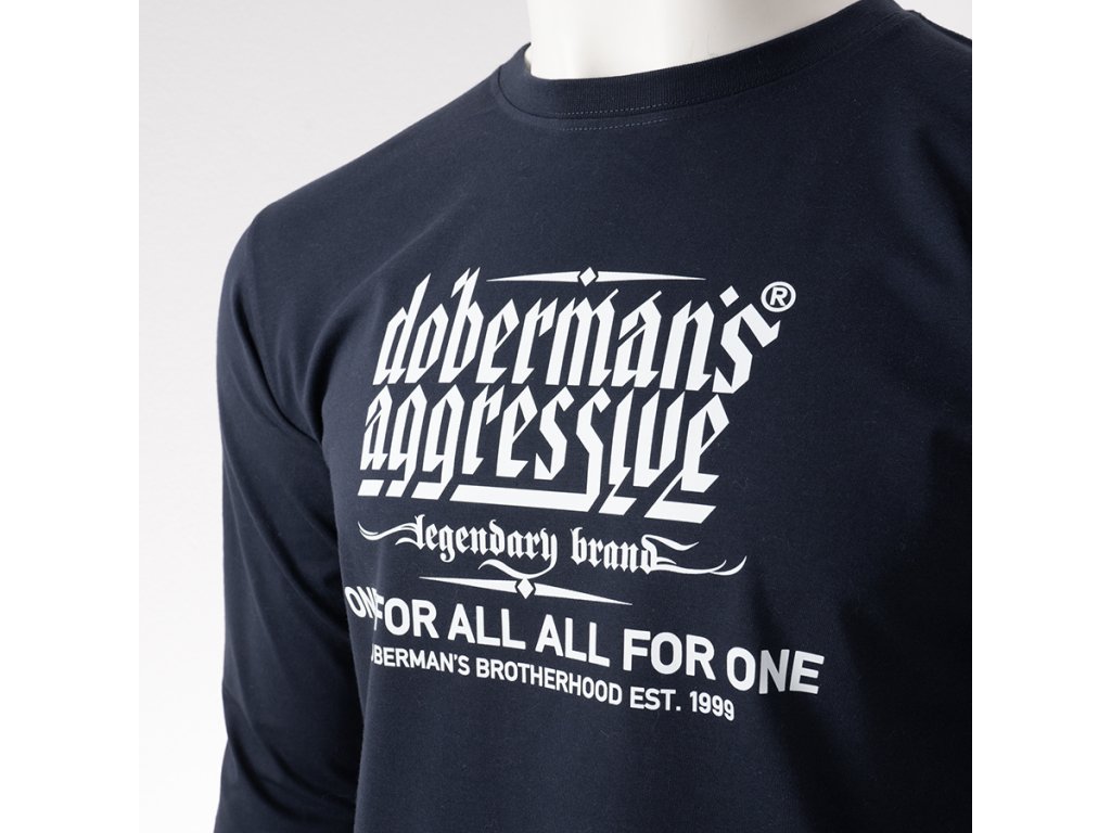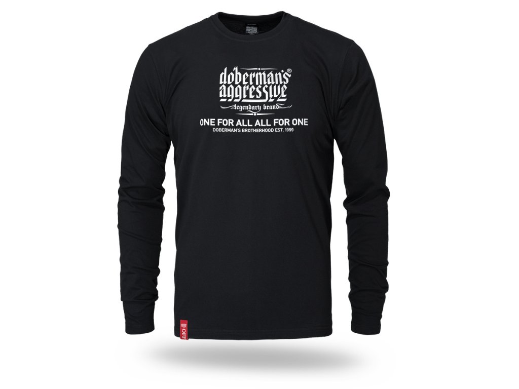 Model s dlhým rukávom a okrúhlym výstrihom, ktorý zabezpečuje pohodlie a voľnosť pohybu. Na prednej strane sa nachádza výrazná potlač s logotypom „Doberman’s Aggressive – legendary brand“ a sloganom „One for all, all for one – Doberman’s Brotherhood est. 1999“, zdôrazňujúcim charakter a identitu značky. Celkový dizajn spája jednoduchosť s výrazným a ľahko rozpoznateľným posolstvom.