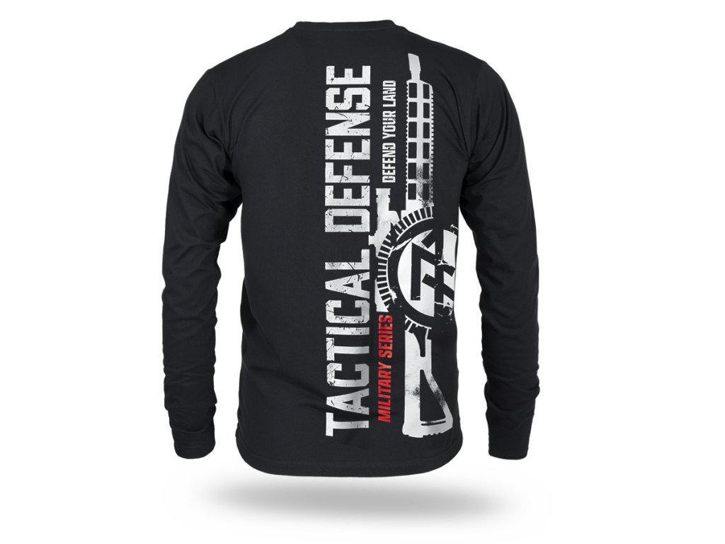 Model je vyrobený z kvalitnej bavlny, ktorá zabezpečuje pohodlie pri nosení a dlhú životnosť. Na hrudi sa nachádza menšia potlač s motívom lebky a skrížených zbraní a nápisom „Tactical Defense“. Zadnú časť zdobí veľká vertikálna grafika s motívom zbrane a výraznými nápismi „Tactical Defense“ a „Military Series“, doplnená detailom „Defend Your Land“. Precízne spracovanie a kvalitná potlač podčiarkujú vojenský charakter dizajnu.