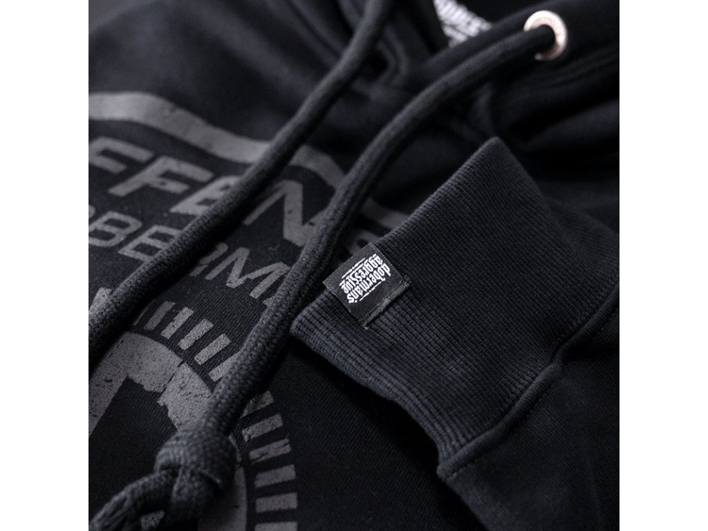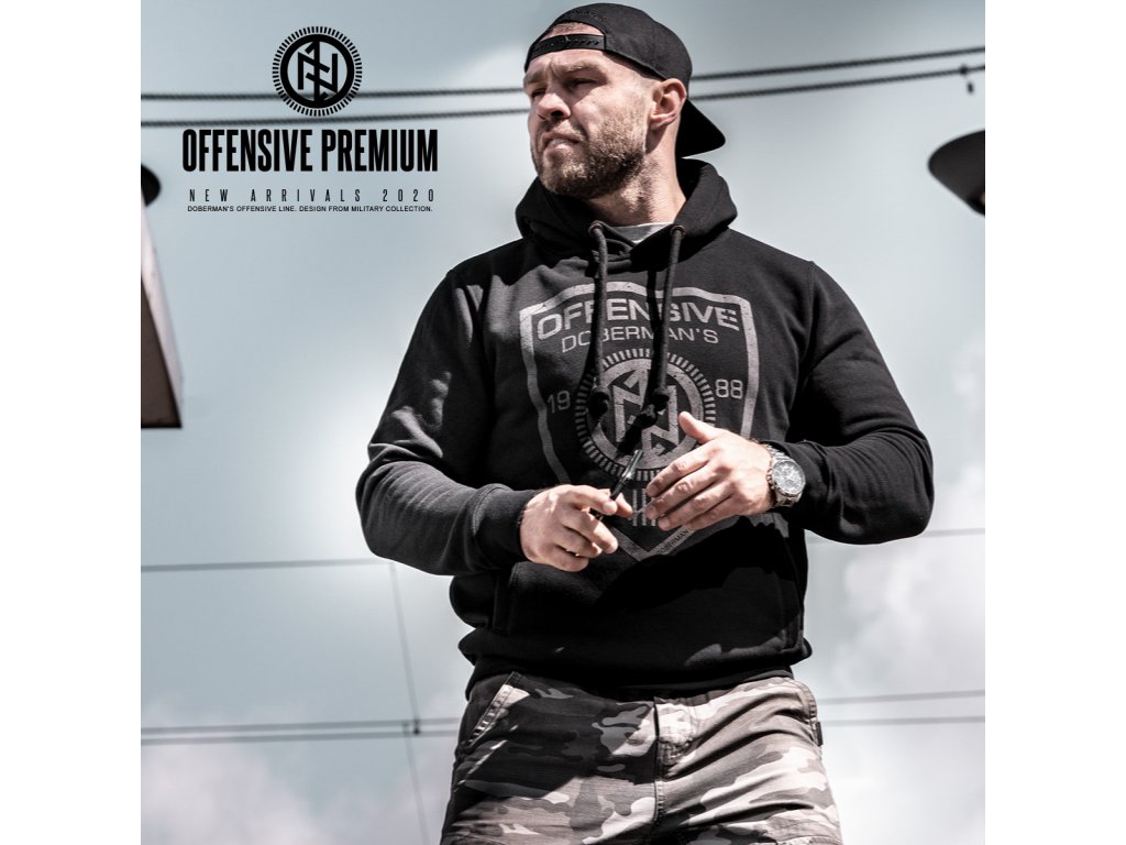 Pri krku, rukávov a v dolnej časti mikiny sú odolné sťahovacie lemy. Objemnú kapucňu je možné nastavovať šnúrkami s kovovými zakončeniami. Na prednej strane sa nachádza veľká charakteristická potlač v podobe štítu s kruhom a rúnovými znakmi, doplnené nápisom Doberman's Offensive. Potlač je vytvorená metódou, ktorá umožňuje získať vypuklý vzor. Vďaka tomu vyzerá mikina veľmi pôsobivo.