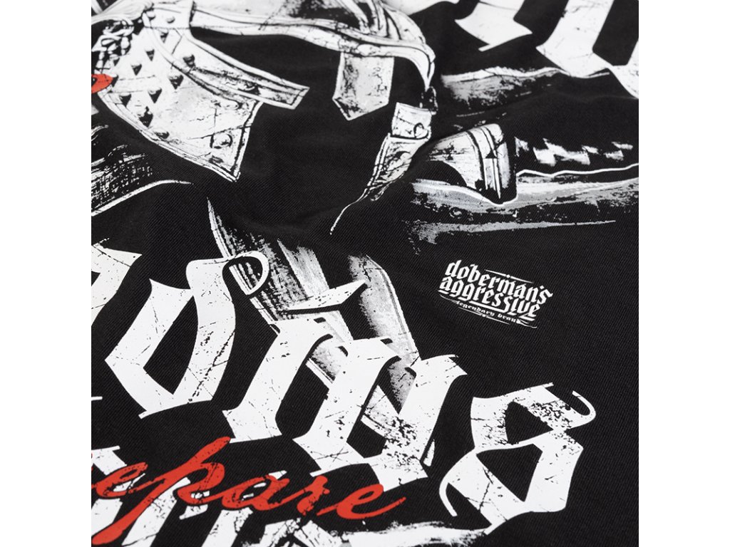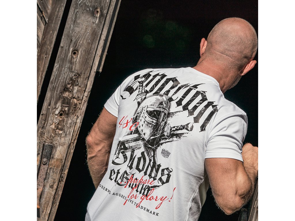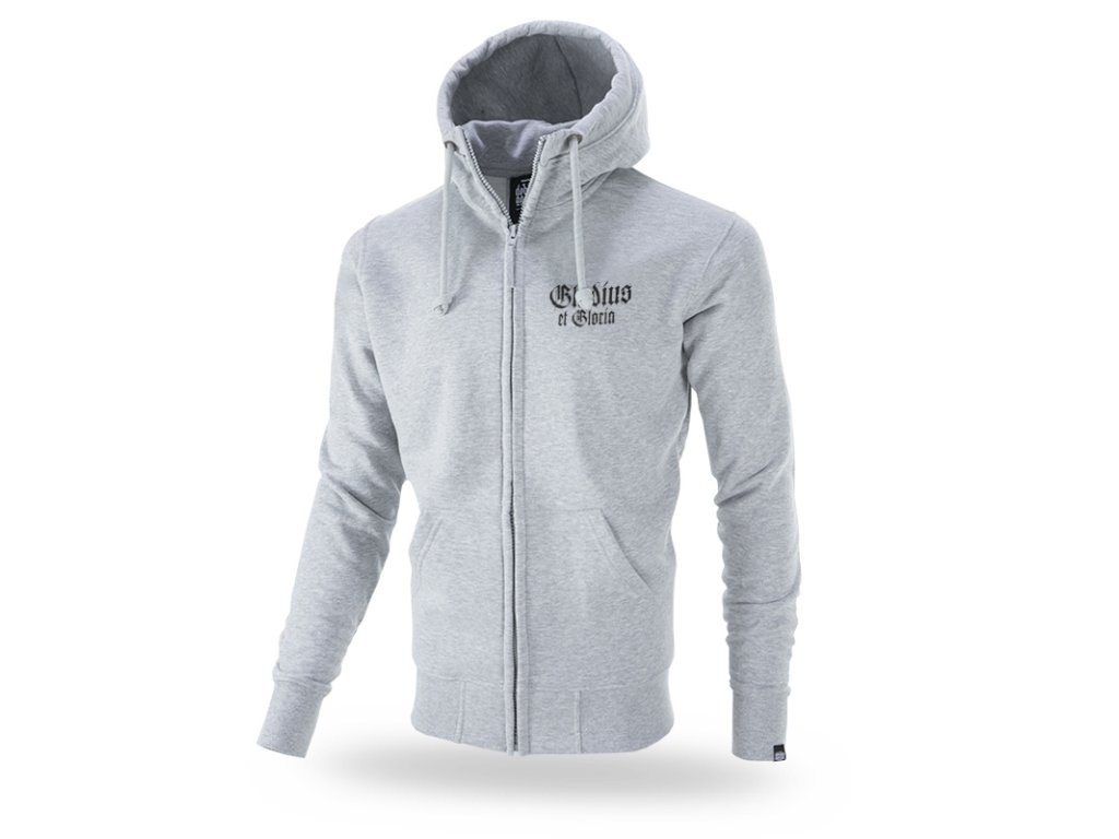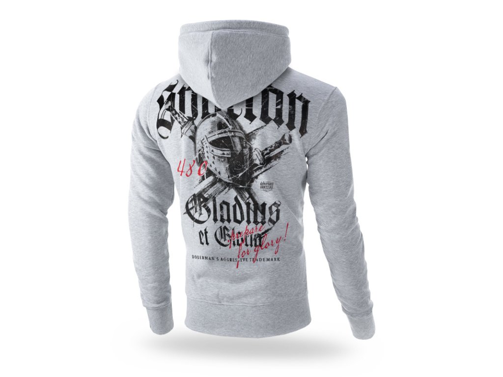 Na ľavom rukáve je našitá malá ceduľka s logom značky. Na ľavej strane hrudi je menší nápis Gladius of Glory. Na zadnej strane mikiny je potlač zobrazujúce skrížené meče a helmu. Celok vzoru uzatvára nápis „SPARTAN GLADIUS OF GLORIA”.