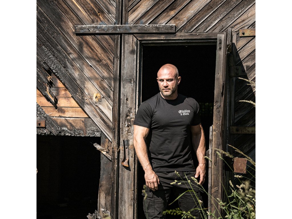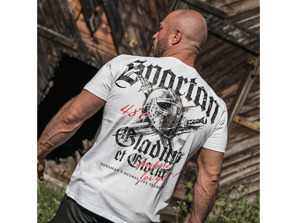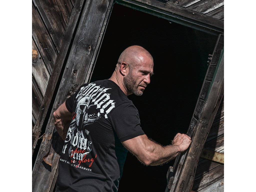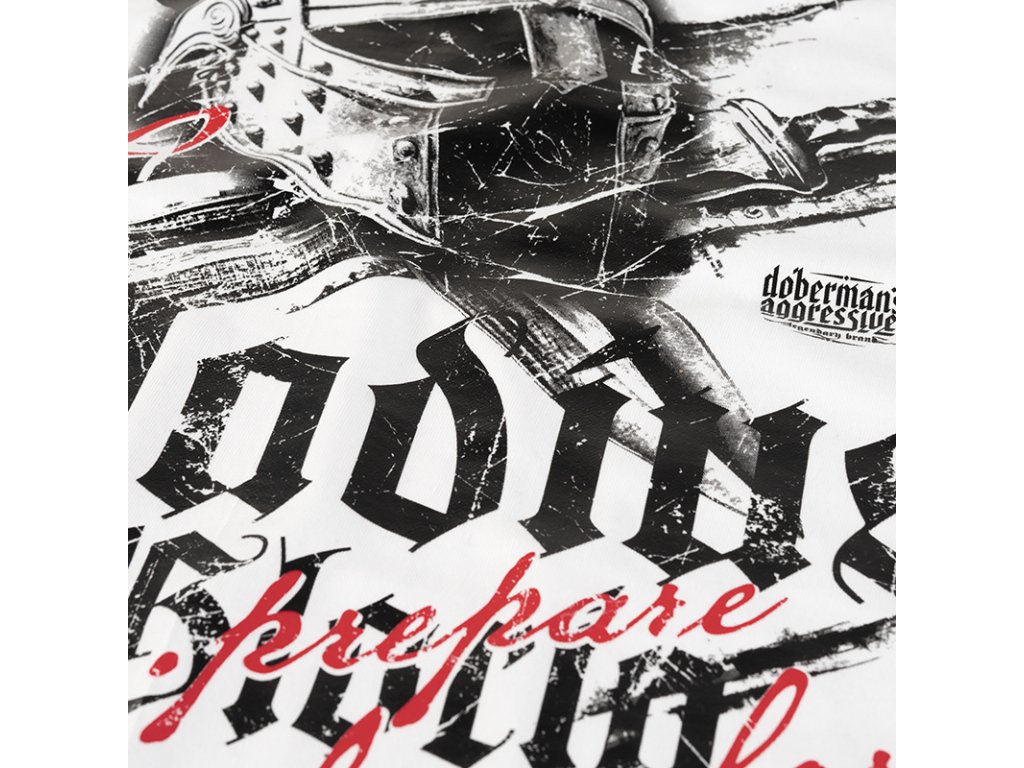 Na ľavom rukáve je našitá malá ceduľka s logom značky. Na ľavej strane hrudi je menší nápis Gladius of Glory. Na zadnej strane mikiny je potlač zobrazujúce skrížené meče a helmu. Celok vzoru uzatvára nápis „SPARTAN GLADIUS OF GLORIA”.