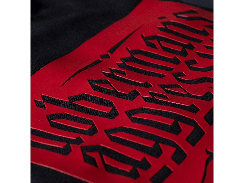 Dolná časť mikiny a rukáve sú zakončené širokým sťahovacím lemom. Na ľavom rukáve je umiestnená malá ceduľka s logom značky. Na prednej strane mikiny je gumová aplikácia s logom značky Doberman's zakomponovanom do tvaru obdĺžnika.