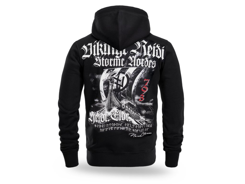 Model zapínaný na zips s nastaviteľnou kapucňou so šnúrkami a dvomi prednými vreckami. Na zadnej strane sa nachádza veľká, výrazná grafika vikingskej lode drakkar plaviacej sa rozbúreným morom, obklopená severskými symbolmi a nápismi inšpirovanými kultúrou a mytológiou Vikingov. Dizajn zdôrazňuje surový, bojovnícky charakter severských bojovníkov. Na hrudi je umiestnená menšia potlač s nápisom „Vikingr Reiði – Nord Storm“, ktorá dopĺňa celkový štýl. Rukávy a spodný lem sú zakončené elastickými patentmi pre lepšie prispôsobenie a pohodlie pri nosení.