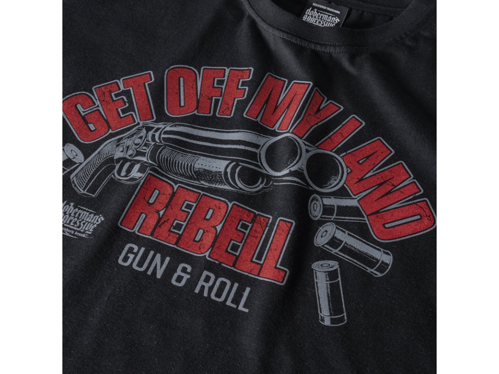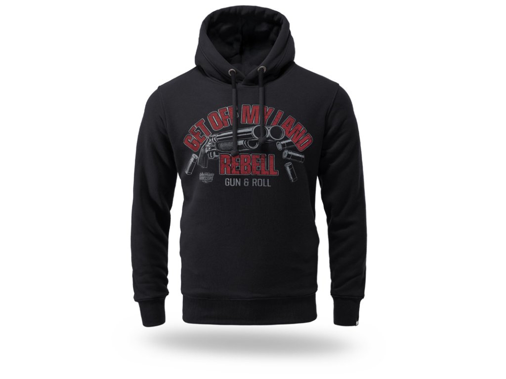 Model je vyrobený z kvalitnej, mäkkej a na dotyk príjemnej bavlny s prídavkom elastanu, ktorý zabezpečuje pohodlie a voľnosť pohybu. Mikina má nastaviteľnú kapucňu so šnúrkami a elastické rebrované manžety na rukávoch a spodnom leme pre lepšie prispôsobenie. Prednú časť zdobí výrazná potlač „GET OFF MY LAND REBELL – GUN & ROLL“ s grafickým motívom, ktorá zvýrazňuje charakter kolekcie. Dizajn dopĺňa decentné logo značky.