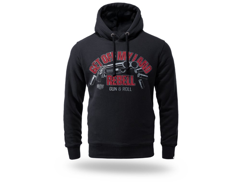 Model je vyrobený z kvalitnej, mäkkej a na dotyk príjemnej bavlny s prídavkom elastanu, ktorý zabezpečuje pohodlie a voľnosť pohybu. Mikina má nastaviteľnú kapucňu so šnúrkami a elastické rebrované manžety na rukávoch a spodnom leme pre lepšie prispôsobenie. Prednú časť zdobí výrazná potlač „GET OFF MY LAND REBELL – GUN & ROLL“ s grafickým motívom, ktorá zvýrazňuje charakter kolekcie. Dizajn dopĺňa decentné logo značky.