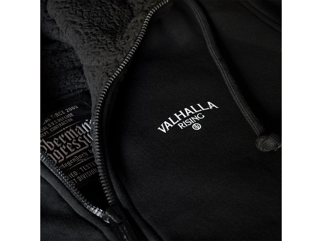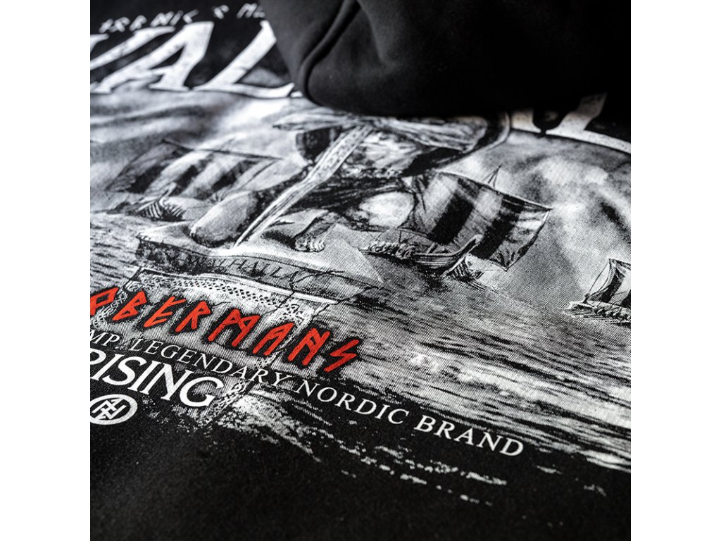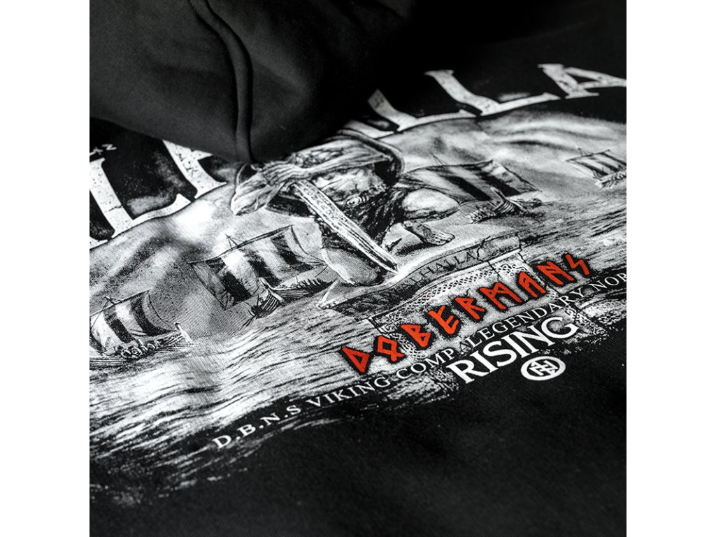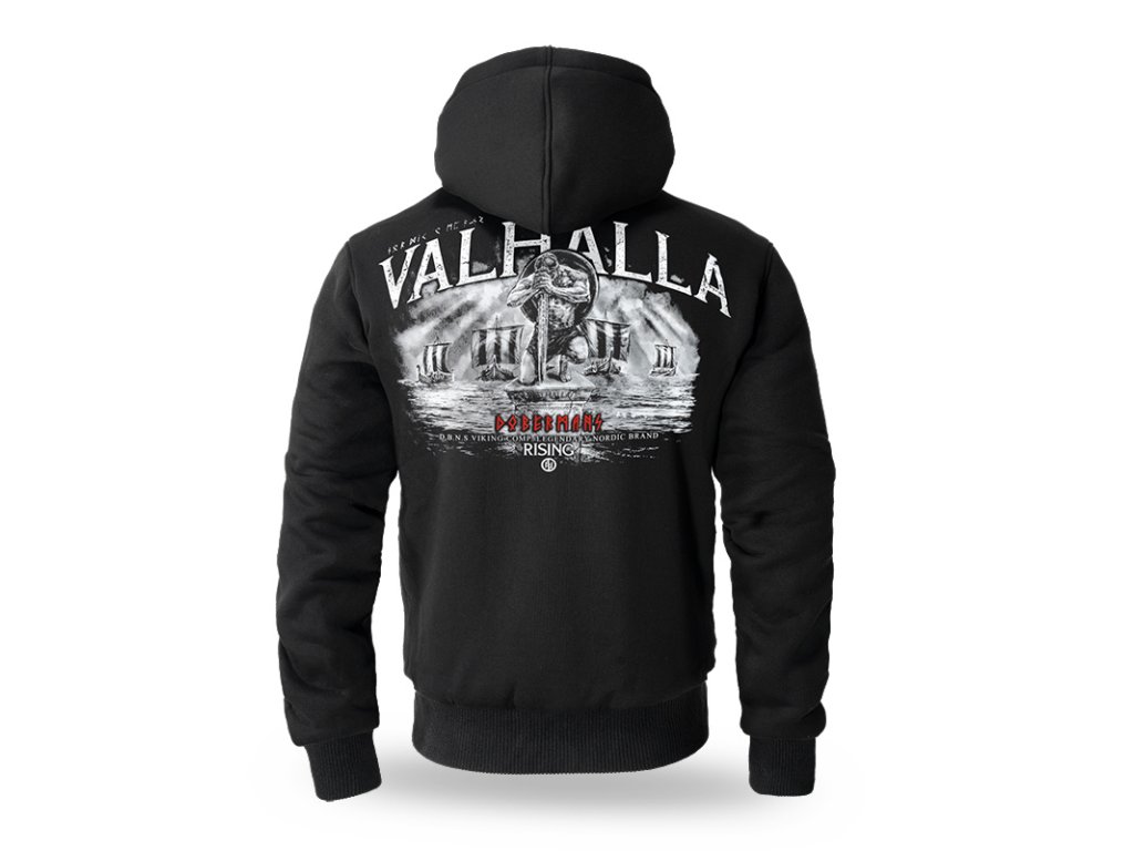 Zvýšený golier prechádza do objemnej kapucne so zateplením. Mikina je vyrobená z vysoko kvalitnej bavlny. Na ľavej strane hrudi je nápis Valhalla Rising. Zadná strana mikiny je pokrytá veľkou potlačou s postavou kľačiaceho Vikinga nad mečom. V pozadí je flotila Drakkarov na mori. Model mikiny čerpá zo severských motívov.