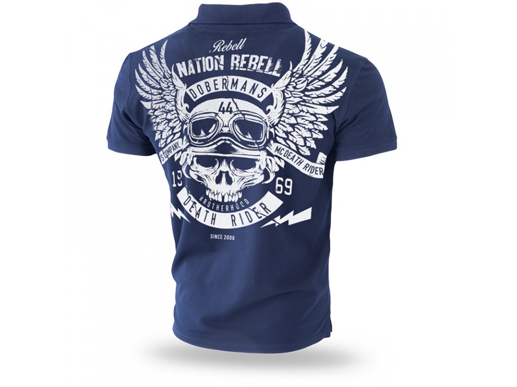 Uprostred vzoru je motív lebky s helmou a okuliarmi, po stranách krídla, nižšie nápis Brotherhood. Prápor s nápisom Dobermans Death Rider, dva blesky a čísla 19 a 69. Na prilbe symbol 44, na krku a na prednej strane trička heslo Rebell 44. Polokošeľa v typickom pánskom strihu je vyrobená zo stopercentnej bavlny vysokej kvality. Tričko má golier na zapínanie, zakončený vnútorným lemovaním a sťahovacími lemy u rukávov.