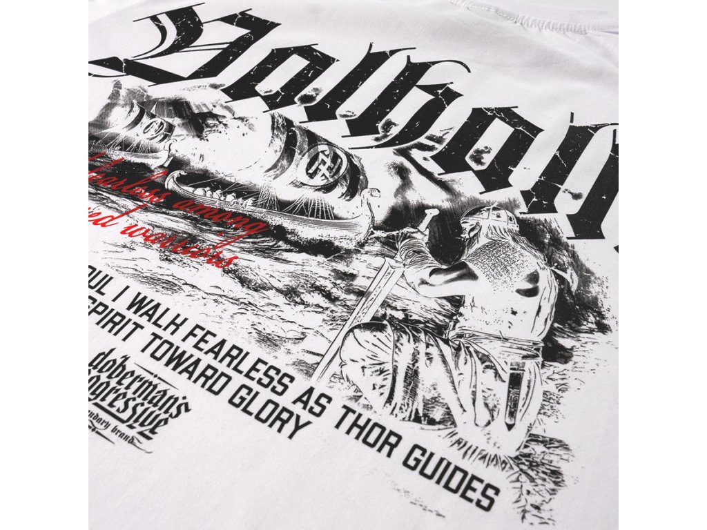Model s jednoduchým a pohodlným strihom, vybavený golierom a légou s gombíkmi pri výstrihu. Na ľavej strane hrude sa nachádza decentné logo „Valhalla“ s grafickým symbolom. Zadnú stranu zdobí veľká, výrazná potlač inšpirovaná severskou mytológiou – s motívom bojovníka a výraznou typografiou „Valhalla“. Celkový dizajn dopĺňajú slogany odkazujúce na česť, odvahu a boj, ktoré zdôrazňujú surový, bojovnícky charakter projektu.
