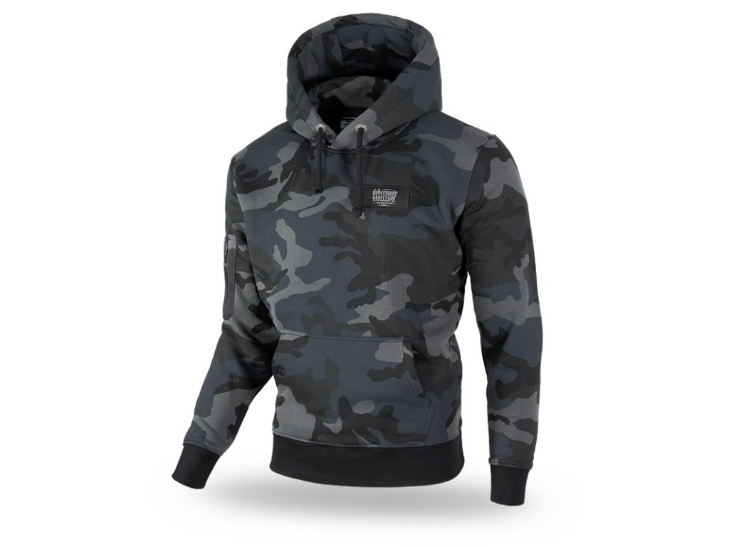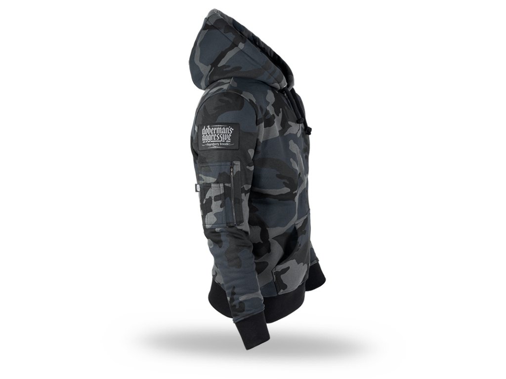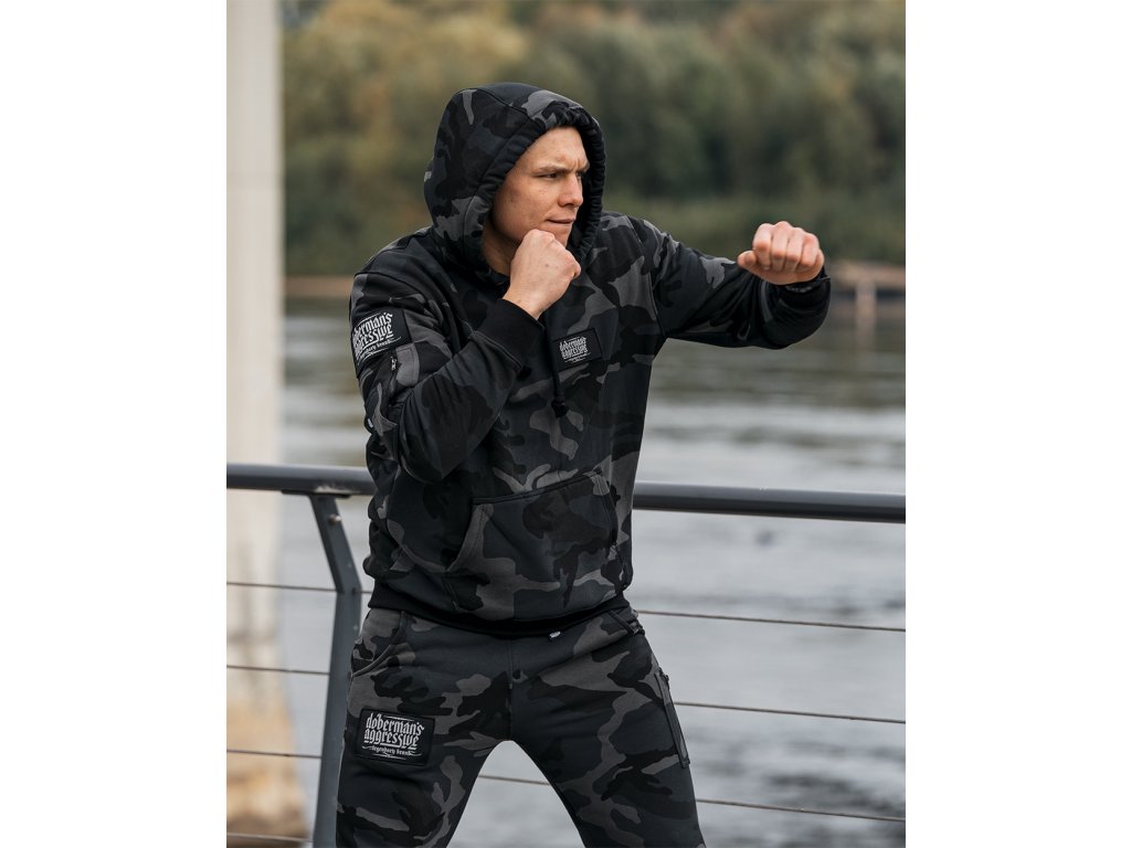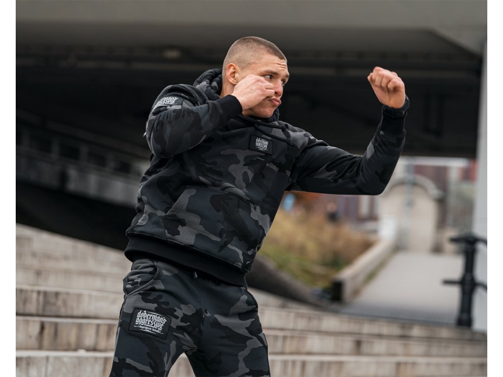 Športová tepláková súprava z hrubej, vysoko kvalitnej bavlny. Súčasťou športovej súpravy je mikina klokanka s kapucňou a dlhé nohavice. Na ľavej strane hrudi je nášivka s logom značky Doberman's Aggressive, prišitá na suchý zips. Podobné už priamo všité nášivky sa nachádzajú na ramene a na nohaviciach pod vreckom.