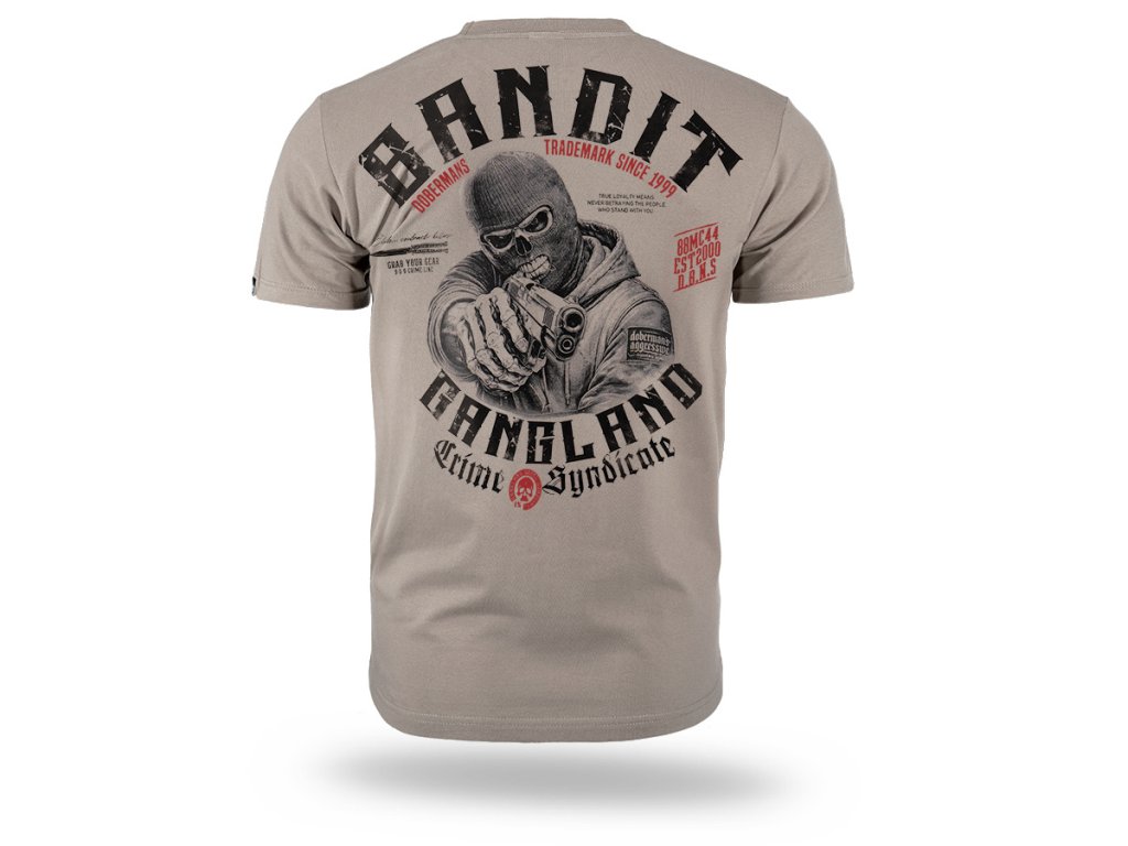Model je vyrobený v pohodlnom klasickom strihu s okrúhlym výstrihom zakončeným elastickým patentom. Na zadnej strane sa nachádza veľká výrazná potlač zobrazujúca maskovanú postavu mieriacu zbraňou, obklopenú nápisom „Banditz Gangland Crime Syndicate“ a ďalšími grafickými prvkami typickými pre značku Doberman’s Aggressive. Na prednej strane je menšia potlač na úrovni hrude. Dynamická grafika zdôrazňuje surový charakter inšpirovaný streetwearovou kultúrou.