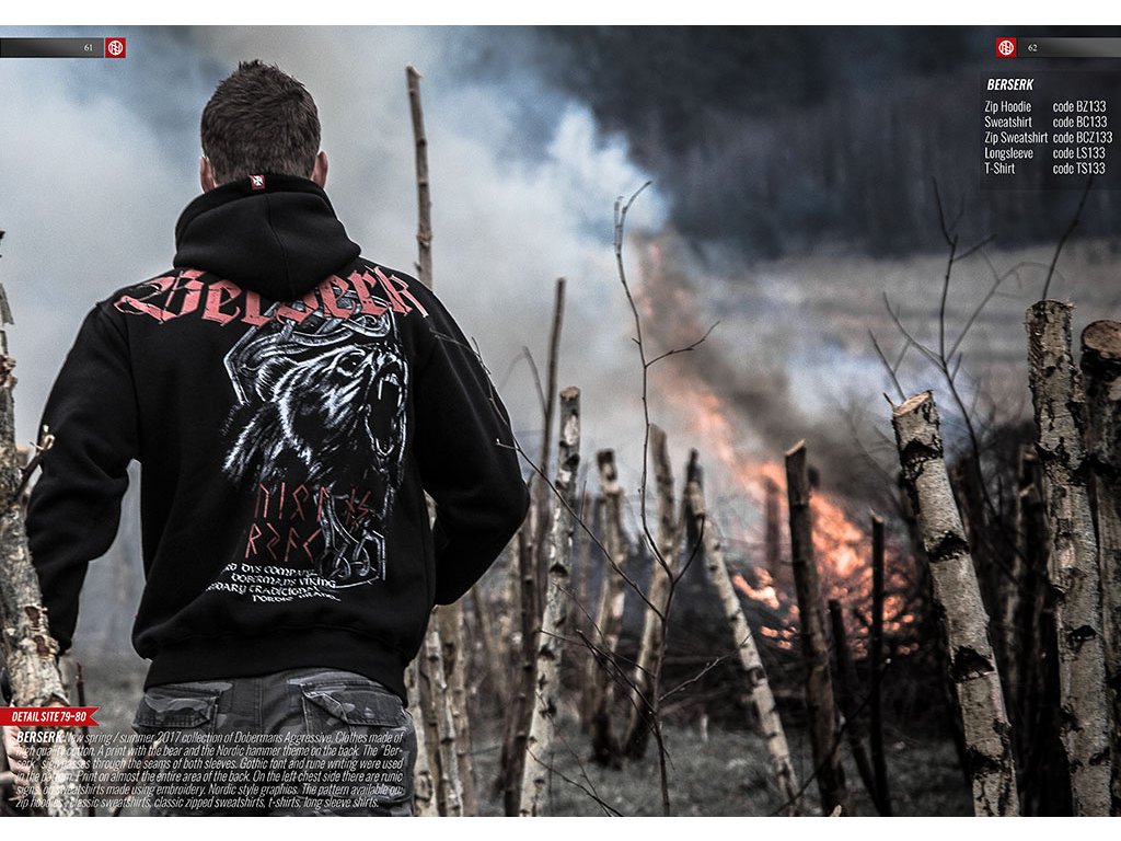 Viditeľné červené prvky v podobe vnútorného plisovania a bočnej ceduľky s logom značky. Na prednej strane runové symboly. Na zadnej strane trička dvojfarebný vzor s hlavou medveďa a polkruhovým nápisom Berserk prechádzajúcim cez švy rukávov. Použité písmo v gotickom štýle. Potlač zaberá značný povrch látky.