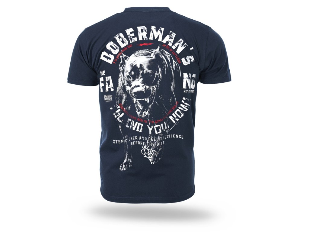 Model s krátkym rukávom a okrúhlym výstrihom zakončeným elastickým patentom. Na zadnej strane sa nachádza veľká, dynamická grafika agresívneho dobermana v útočnej póze, doplnená výraznými sloganmi zdôrazňujúcimi nekompromisný charakter dizajnu. Na hrudi je umiestnená menšia potlač s názvom značky a motívom boxera. Celkový vzhľad odráža výrazný, vojensky inšpirovaný štýl typický pre kolekciu Doberman’s Aggressive – pre tých, ktorí oceňujú silné posolstvo a výrazný dizajn.
