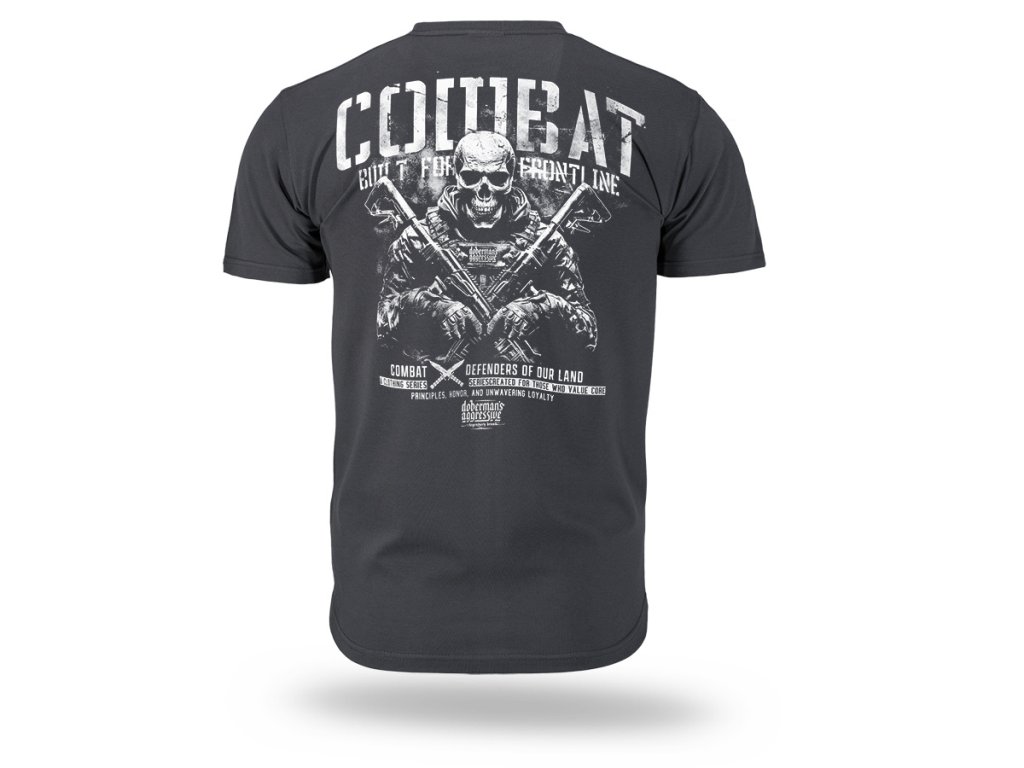 Model s krátkym rukávom, obliekaný cez hlavu, s okrúhlym výstrihom zakončeným elastickým patentom. Na chrbte sa nachádza veľká, výrazná potlač s taktickým motívom a sloganom „Combat – Built for the Frontline“ spolu s ďalšími detailmi zdôrazňujúcimi vojenský charakter kolekcie. Na prednej strane je menší emblém na hrudi nadväzujúci na hlavnú grafiku. Strih zabezpečuje pohodlie a voľnosť pohybu, vďaka čomu je vhodný na každodenné nosenie aj na outfity inšpirované vojenským štýlom.