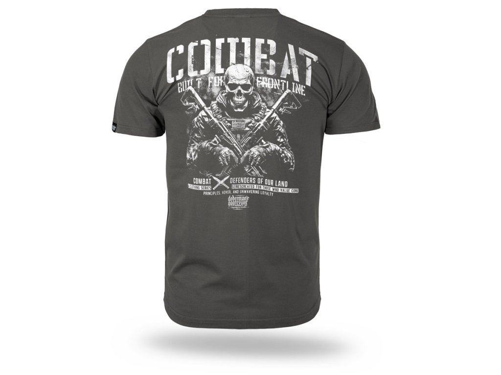 Model s krátkym rukávom, obliekaný cez hlavu, s okrúhlym výstrihom zakončeným elastickým patentom. Na chrbte sa nachádza veľká, výrazná potlač s taktickým motívom a sloganom „Combat – Built for the Frontline“ spolu s ďalšími detailmi zdôrazňujúcimi vojenský charakter kolekcie. Na prednej strane je menší emblém na hrudi nadväzujúci na hlavnú grafiku. Strih zabezpečuje pohodlie a voľnosť pohybu, vďaka čomu je vhodný na každodenné nosenie aj na outfity inšpirované vojenským štýlom.