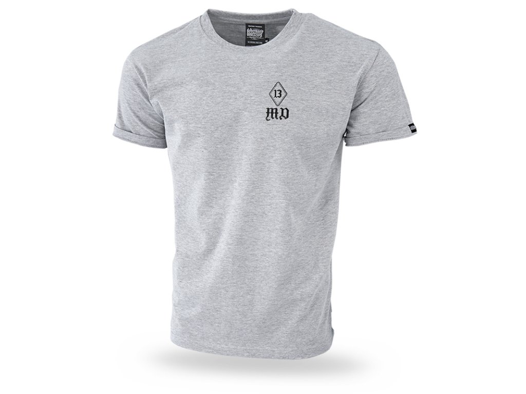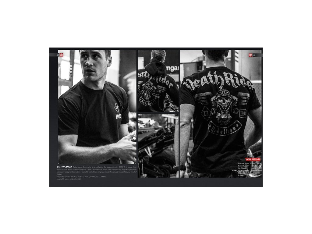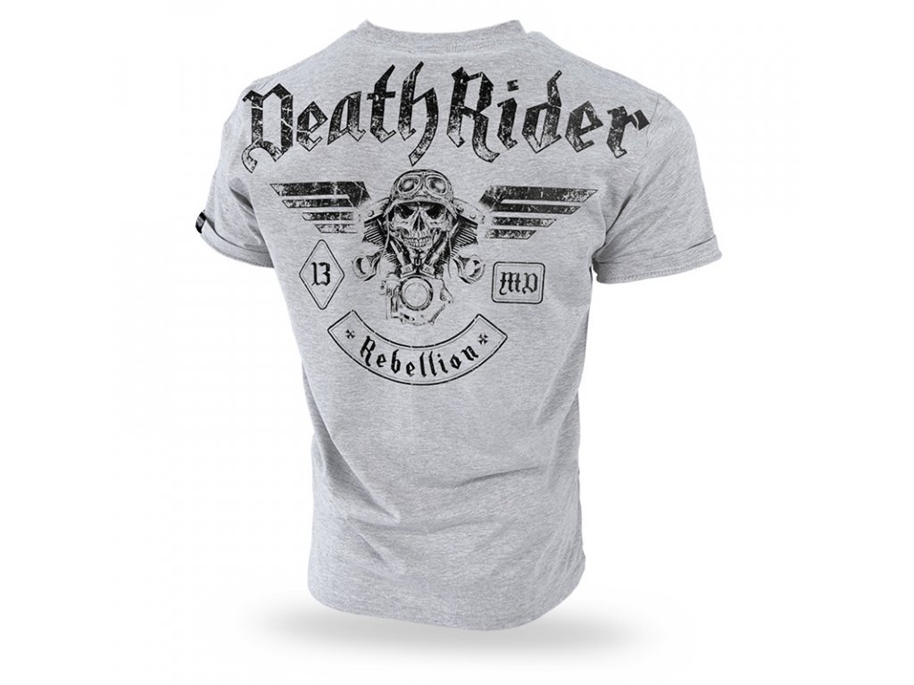Tričko má klasický strih, materiál 100% bavlna, hmotnosť 200 g. Na chrbte trička je veľký nápis Death Rider, ktorý pokračuje cez švy rukávov a ďalej grafika s motívom motoriek. Na ľavej prednej časti vytlačený logotyp 13, symbol kolekcie Death Rider.