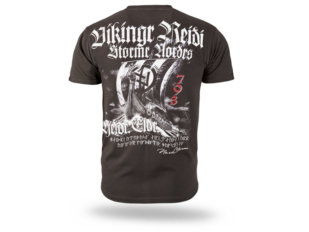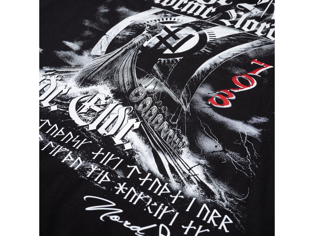 Na zadnej strane sa nachádza veľká, výrazná grafika vikingskej lode drakkar plaviacej sa rozbúreným morom, obklopená severskými symbolmi a nápismi inšpirovanými motívmi severských bojovníkov. Dizajn zdôrazňuje surový, bojovnícky charakter inšpirovaný kultúrou Vikingov. Na hrudi je umiestnená menšia potlač s nápisom „Vikingr Reiði – Nord Storm“, ktorá dopĺňa celkový štýl.