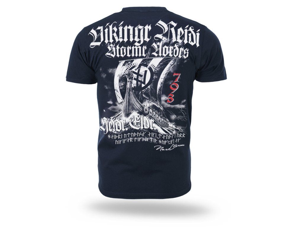 Na zadnej strane sa nachádza veľká, výrazná grafika vikingskej lode drakkar plaviacej sa rozbúreným morom, obklopená severskými symbolmi a nápismi inšpirovanými motívmi severských bojovníkov. Dizajn zdôrazňuje surový, bojovnícky charakter inšpirovaný kultúrou Vikingov. Na hrudi je umiestnená menšia potlač s nápisom „Vikingr Reiði – Nord Storm“, ktorá dopĺňa celkový štýl.