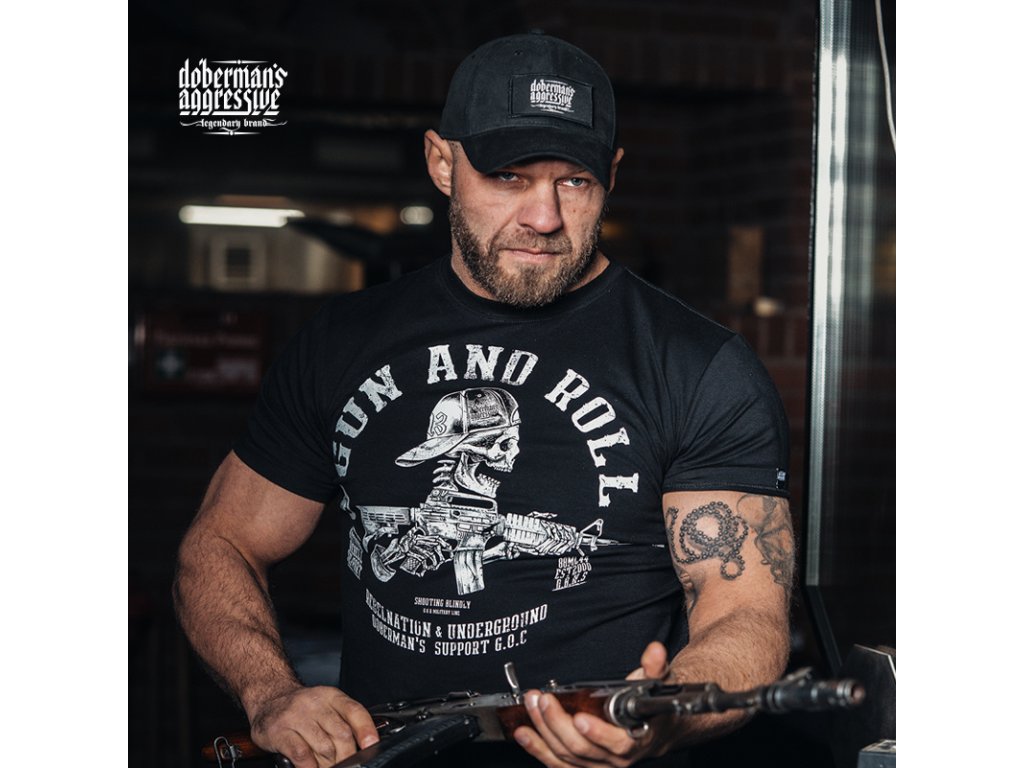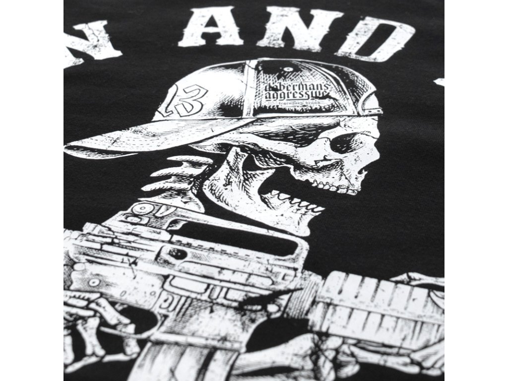 Na ľavom rukáve je malá nášivka s logom značky. Na prednej strane je vzor lebky v šiltovke so zbraňou M4 a nápisom GUN AND ROLL. Na zadnej strane je miniatúra vzoru a logo Doberman's Aggressive.