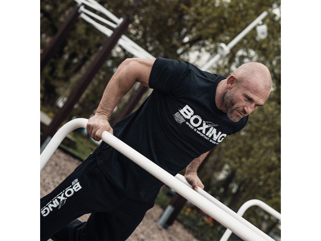 Vyrobené z bavlny s vysokou hmotnosťou. Na ľavom rukáve je našitá malá ceduľka s logom značky. Na prednej strane je vytlačený veľký vzor s nápisom BOXING. Na zadnej strane, pozdĺž chrbta sa nachádza potlač BOXING a logo DOBERMAN'S.