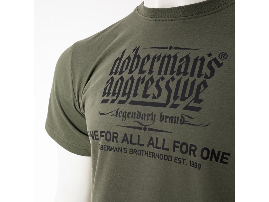 Model s okrúhlym výstrihom zakončeným rebrovaným lemom a krátkymi rukávmi, ktorý zabezpečuje pohodlie pri každodennom nosení. Na prednej strane sa nachádza výrazná potlač s logom „Doberman’s Aggressive – legendary brand“ a sloganom „One for all, all for one – Doberman’s Brotherhood est. 1999“, ktorý zdôrazňuje charakter a identitu značky. Zadná strana trička zostáva hladká, čo dodáva celku minimalistický vzhľad a zvýrazňuje výrazné posolstvo na prednej strane.