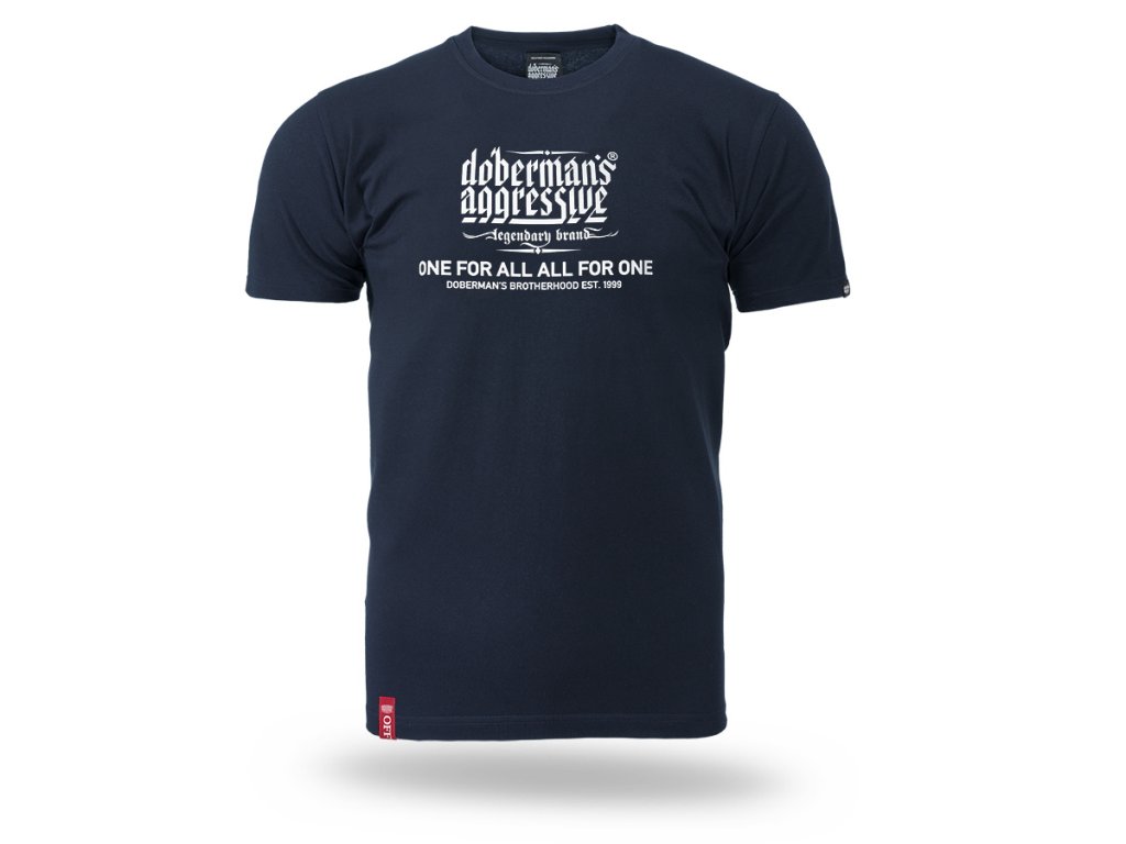 Model s okrúhlym výstrihom zakončeným rebrovaným lemom a krátkymi rukávmi, ktorý zabezpečuje pohodlie pri každodennom nosení. Na prednej strane sa nachádza výrazná potlač s logom „Doberman’s Aggressive – legendary brand“ a sloganom „One for all, all for one – Doberman’s Brotherhood est. 1999“, ktorý zdôrazňuje charakter a identitu značky. Zadná strana trička zostáva hladká, čo dodáva celku minimalistický vzhľad a zvýrazňuje výrazné posolstvo na prednej strane.