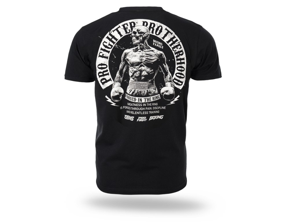 Model je vyrobený v pohodlnom klasickom strihu s okrúhlym výstrihom a krátkymi rukávmi. Na zadnej strane sa nachádza veľká potlač s motívom boxera a nápisom „Pro Fighter Brotherhood – Forged in the Ring“, ktorý odkazuje na ducha boja, odhodlanie a bratstvo vo svete bojových športov. Na hrudi je umiestnené menšie logo v rovnakom štýle. Tričko je navrhnuté na každodenné nosenie a spája pohodlie s výrazným štýlom inšpirovaným boxom. Starostlivo spracovaná potlač a kvalitné vyhotovenie zdôrazňujú charakter a odolnosť modelu.
