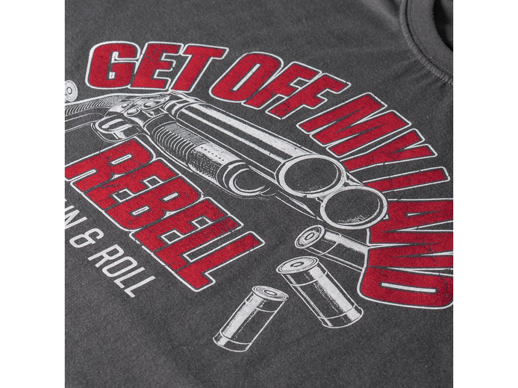 Vyrobené z vysoko kvalitnej bavlny, ktorá zaručuje pohodlie a odolnosť. Na prednej strane sa nachádza výrazná potlač s motívom zbrane a nápisom „Get Off My Land REBELL Gun & Roll“, ktorá dodáva modelu výrazný a charakteristický štýl. Zadná strana zostáva hladká, bez ďalších ozdôb. Model ideálny na každodenné nosenie pre tých, ktorí preferujú odvážny dizajn.