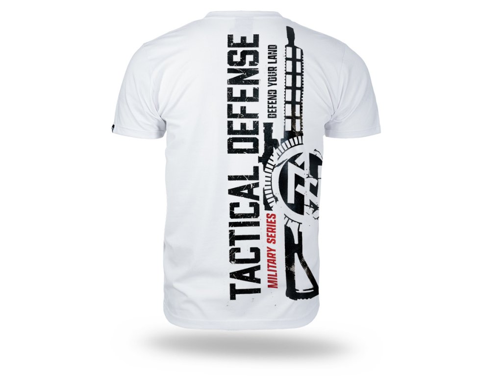 Model je vyrobený z kvalitnej bavlny, ktorá zabezpečuje komfort pri nosení a dobrú priedušnosť. Na prednej strane sa nachádza decentná potlač s motívom lebky a skrížených zbraní a nápisom „Tactical Defense“. Zadná časť zaujme výraznou, dynamickou grafikou s motívom pušky, technickými prvkami a vertikálnym nápisom „Tactical Defense – Military Series – Defend Your Land“. Celkový dizajn je ladený do vojenského, výrazného štýlu pre tých, ktorí uprednostňujú odvážny vzhľad a silný charakter.