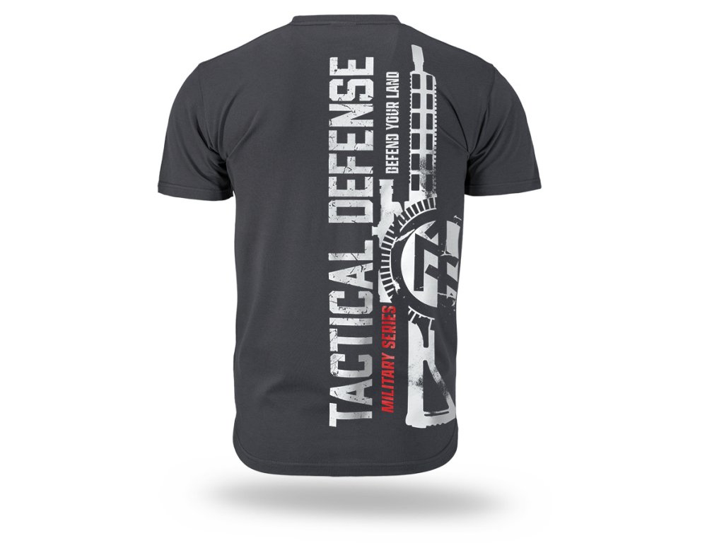 Model je vyrobený z kvalitnej bavlny, ktorá zabezpečuje komfort pri nosení a dobrú priedušnosť. Na prednej strane sa nachádza decentná potlač s motívom lebky a skrížených zbraní a nápisom „Tactical Defense“. Zadná časť zaujme výraznou, dynamickou grafikou s motívom pušky, technickými prvkami a vertikálnym nápisom „Tactical Defense – Military Series – Defend Your Land“. Celkový dizajn je ladený do vojenského, výrazného štýlu pre tých, ktorí uprednostňujú odvážny vzhľad a silný charakter.