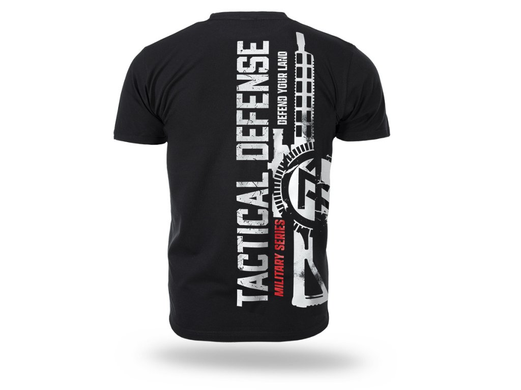 Model je vyrobený z kvalitnej bavlny, ktorá zabezpečuje komfort pri nosení a dobrú priedušnosť. Na prednej strane sa nachádza decentná potlač s motívom lebky a skrížených zbraní a nápisom „Tactical Defense“. Zadná časť zaujme výraznou, dynamickou grafikou s motívom pušky, technickými prvkami a vertikálnym nápisom „Tactical Defense – Military Series – Defend Your Land“. Celkový dizajn je ladený do vojenského, výrazného štýlu pre tých, ktorí uprednostňujú odvážny vzhľad a silný charakter.