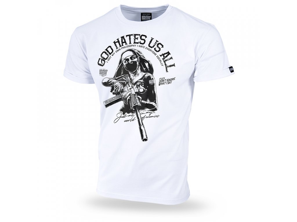 Model The Nun je vytvorený pre vyvolených. Tričko s veľkou potlačou postavy mníšky so zbraňou a nápisom GOD HATES US ALL a s logom značky Doberman's Aggressive.