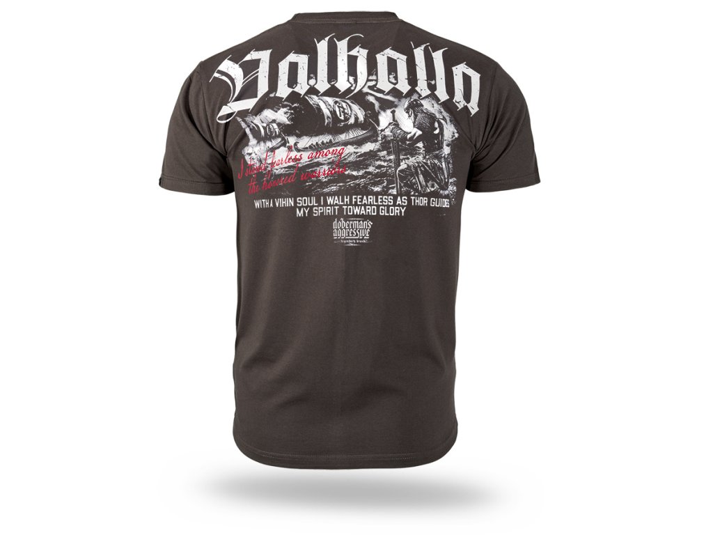 Model s okrúhlym výstrihom zakončeným rebrovaným lemom, ktorý zabezpečuje pohodlné nosenie a voľnosť pohybu. Na ľavej strane hrude sa nachádza malé logo „Valhalla“ s grafickým symbolom. Zadnú stranu zdobí veľká, výrazná potlač inšpirovaná severskou mytológiou – s motívom bojovníka a výraznou typografiou „Valhalla“. Dizajn dopĺňajú slogany odkazujúce na odvahu, česť a boj, ktoré zdôrazňujú surový, bojovnícky charakter kolekcie.